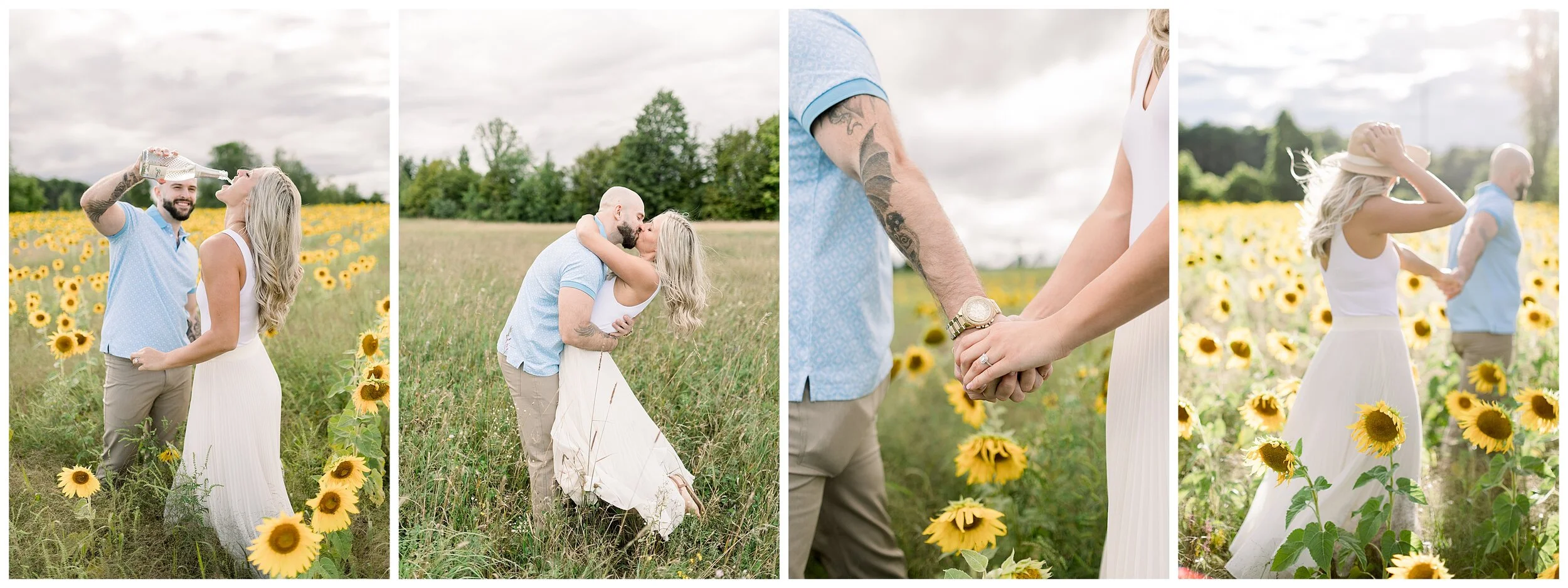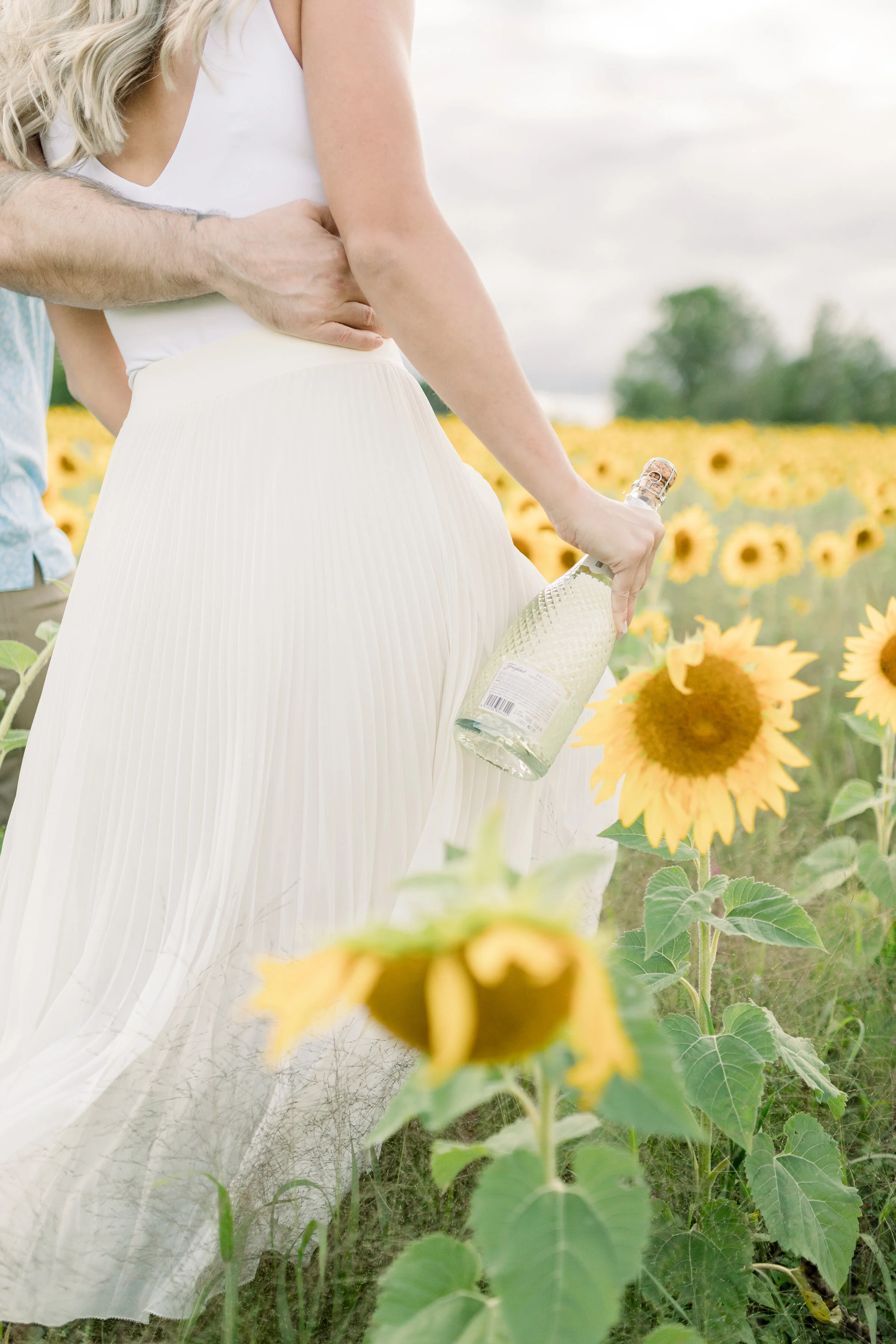 It was a very weird day for a photo shoot. The day started out with deep and dark storm clouds, which soon turned to the hottest, most blazing sun ever, and then again, back to darkness. Weird. Luckily it never rained! Though, playing in the rain in this sunflower field would have been really fun with these two! Jenn and Scott just happily frolicked through the fields for an hour, popping champagne, and making my job easy! Also, Jennifer rocked a custom jean-jacket and I was obsessed!