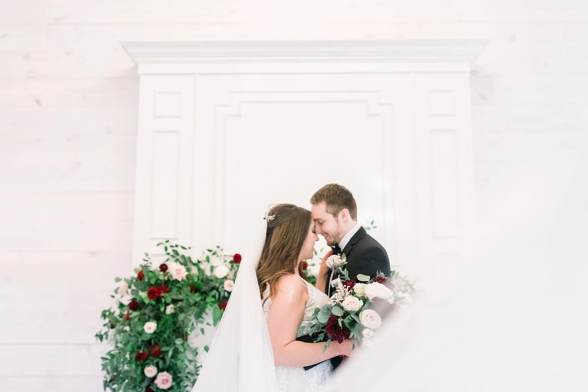 The wedding showcased so many amazing details. They chose an incredible floral installation to drape across the fireplace and then repurposed it for their head table! Bride tip: always use and reuse the gorgeous ceremony florals every way you can throughout the day! I loved the rich, fall colour palette— an elegant combination of greens, neutrals, and wine. Katherine absolutely glowed in her stunning gown, and her bridesmaids really popped against the green trees in their dark dresses. Another favorite details was Katherine and Chad’s sweetheart table. They had a small table at their reception set just for the two of them, and it was one of the dreamiest setups I’d ever seen!